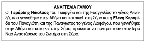 Αναγγελία Γάμου Γεράρδη Νικολάου και Ελένης Κεραμίδα Κείμενο Βλέπε εικόνα. Αριθμός Φύλλου: 5900 Κατηγορία: Αναγγελία Γάμου