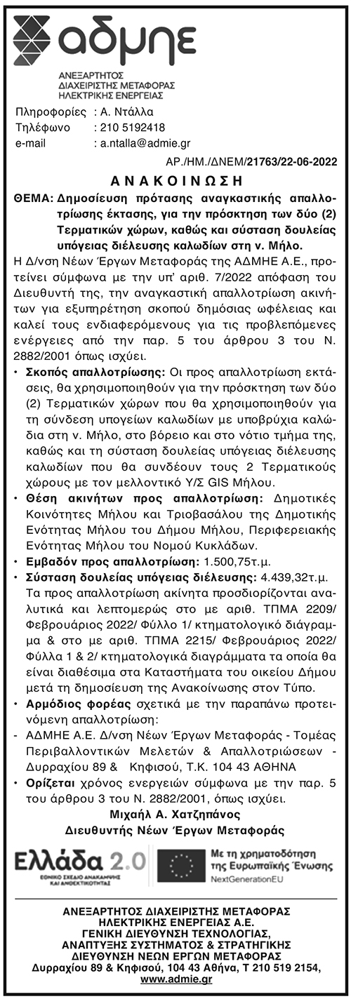 Πρόταση αναγκαστικής απαλλοτρίωσης έκτασης, για την πρόσκτηση των δύο (2) Τερματικών χώρων, καθώς και σύσταση δουλείας υπόγειας διέλευσης καλωδίων στη ν. Μήλο