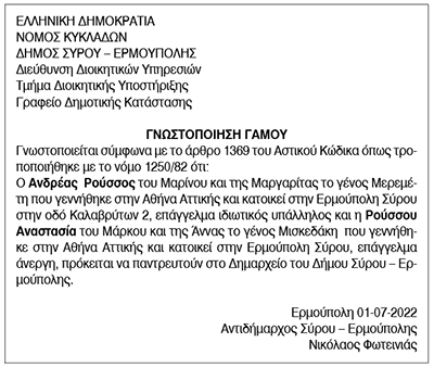 Γνωστοποίηση Γάμου Ανδρέα Ρούσσου και Αναστασίας Ρούσσου Κείμενο Βλέπε εικόνα. Αριθμός Φύλλου: 5908 Κατηγορία: Γνωστοποίηση Γάμου
