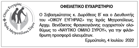 Ευχαριστήριο από τον οίκο Ευγηρίας της Ιεράς Μητροπόλεως Σύρου Κείμενο Βλέπε εικόνα. Αριθμός Φύλλου: 5909 Κατηγορία: Ευχαριστήριο