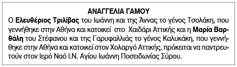 Αναγγελία Γάμου Ελευθέριου Τριλίβα και Μαρίας Βαρθάλη Κείμενο Βλέπε εικόνα. Αριθμός Φύλλου: 5909 Κατηγορία: Αναγγελία Γάμου