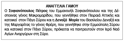 Αναγγελία Γάμου Σοφιανόπουλου Πέτρου και Δεναξά Μαρίας Κείμενο Βλέπε εικόνα. Αριθμός Φύλλου: 5917 Κατηγορία: Αναγγελία Γάμου