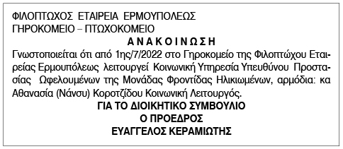 Ανακοίνωση από τη Φιλόπτωχο Εταιρεία Ερμουπόλεως , Γηροκομείο - Πτωχοκομείο Κείμενο Βλέπε εικόνα. Αριθμός Φύλλου: 5920 Κατηγορία: Ανακοίνωση