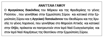 Αναγγελία Γάμου Βακόνδιου Φραγκίσκου και Αγγελικής Παπαϊωάννου Κείμενο Βλέπε εικόνα. Αριθμός Φύλλου: 5924 Κατηγορία: Αναγγελία Γάμου