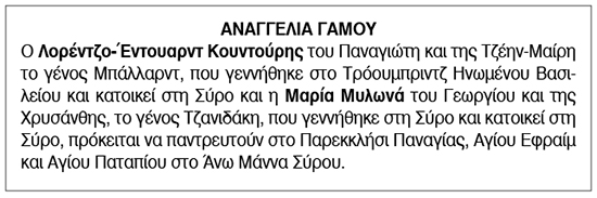 Αναγγελία Γάμου Λορέντζο - Έντουαρτ Κουντουρη και Μαρίας Μυλωνά Κείμενο Βλέπε εικόνα. Αριθμός Φύλλου: 5926 Κατηγορία: Αναγγελία Γάμου