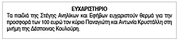 Ευχαριστήριο από τη Στέγη Ανηλίκων Σύρου Κείμενο Βλέπε εικόνα. Αριθμός Φύλλου: 5930 Κατηγορία: Δωρεές