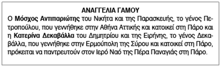 Αναγγελία Γάμου Μόσχου Αντιπαριώτη και Δεκαβάλλα Αικατερίνης Κείμενο Βλέπε εικόνα. Αριθμός Φύλλου: 5934 Κατηγορία: Αναγγελία Γάμου