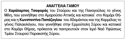 Αναγγελία Γάμου Χαράλαμπου Τσαφαρά και Κωνσταντίνας Παπάζογλου Κείμενο Βλέπε εικόνα. Αριθμός Φύλλου: 5936 Κατηγορία: Αναγγελία Γάμου