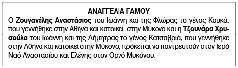 Αναγγελία Γάμου Ζουγανέλη Αναστάσιου και Τζουνάρα Χρυσούλας Κείμενο Βλέπε εικόνα. Αριθμός Φύλλου: 5941 Κατηγορία: Αναγγελία Γάμου
