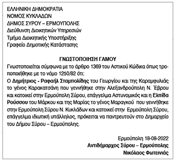 Γνωστοποίηση Γάμου Δημητρίου - Ραφαήλ Σταμπολίδη και Ρούσσου Ελπίδας Κείμενο Βλέπε εικόνα. Αριθμός Φύλλου: 5943 Κατηγορία: Γνωστοποίηση Γάμου