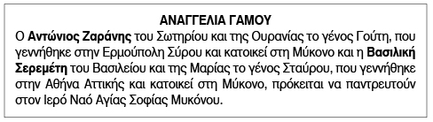 Αναγγελία Γάμου Αντώνιου Ζαράνη και Βασιλικής Σερεμέτη Κείμενο Βλέπε εικόνα. Αριθμός Φύλλου: 5948 Κατηγορία: Αναγγελία Γάμου