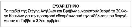 Ευχαριστήριο από τη Στέγη ανηλίκων και Εφήβων Σύρου Κείμενο Βλέπε εικόνα. Αριθμός Φύλλου: 5955 Κατηγορία: Δωρεές