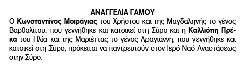 Αναγγελία Γάμου Κωνσταντίνου Μοιράγια και Καλλιόπης Πρέκα Κείμενο Βλέπε εικόνα. Αριθμός Φύλλου: 5955 Κατηγορία: Αναγγελία Γάμου