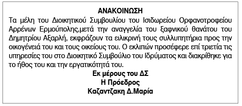 Συλλυπητήρια από το Ισιδώρειο Ορφανοτροφείο προς την οικογένεια Δημητρίου Αξαρλή Κείμενο Βλέπε εικόνα. Αριθμός Φύλλου: Αριθμός Φύλλου 5956 Κατηγορία: Κατηγορία Ανακοίνωση