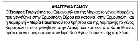 Αναγγελία Γάμου Σταύρου Τσιριγώτη και Λαμπρινής - Μαρίας Παλατιανού Κείμενο Βλέπε εικόνα. Αριθμός Φύλλου: 5959 Κατηγορία: Αναγγελία Γάμου
