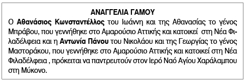Αναγγελία Γάμου Αθανάσιου Κωνσταντέλλου και Αντωνίας Πάνου Κείμενο Βλέπε εικόνα. Αριθμός Φύλλου: 5959 Κατηγορία: Αναγγελία Γάμου