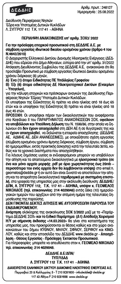 Περίληψη Ανακοίνωσης υπ' αριθμ. ΣΟΧ3 /2022 από τη ΔΕΔΔΗΕ Κείμενο Βλέπε εικόνα. Αριθμός Φύλλου: 5960 Κατηγορία: Προκήρυξη Θέσεων