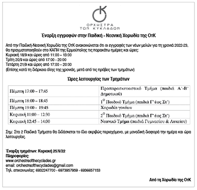 Χορωδία των Κυκλάδων, Εγγραφές για το έτος 2022-23 Κείμενο Βλέπε εικόνα. Αριθμός Φύλλου: 5962 Κατηγορία: Ανακοίνωση