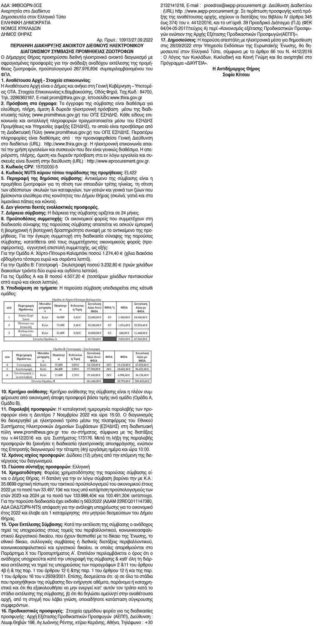 Προμήθεια Ζωοτροφών από το Δήμο Θήρας Κείμενο Βλέπε εικόνα. Αριθμός Φύλλου: Αριθμός Φύλλου 5975 Κατηγορία: Κατηγορία Προκήρυξη Έργων - Δημοπρασίες