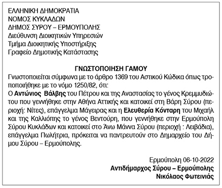 Γνωστοποίηση Γάμου Αντωνίου Βάλβη και Ελευθερίας Κόνταρη Κείμενο Βλέπε εικόνα. Αριθμός Φύλλου: 5976 Κατηγορία: Γνωστοποίηση Γάμου