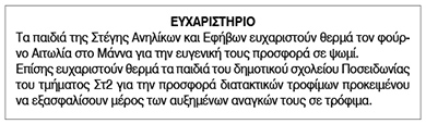 Δωρεές στη Στέγη Ανηλίκων και Εφήβων Σύρου Κείμενο Βλέπε εικόνα. Αριθμός Φύλλου: 5977 Κατηγορία: Δωρεές