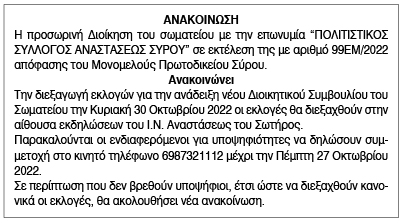 Ανακοίνωση διεξαγωγής εκλογών για την ανάδειξη νέου Διοικητικού Συμβουλίου από από την προσωρινή διοίκηση του σωματείου με την επωνυμία "ΠΟΛΙΤΙΣΤΙΚΟΣ ΣΥΛΛΟΓΟΣ ΑΝΑΣΤΑΣΕΩΣ ΣΥΡΟΥ"