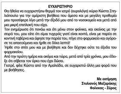 Ευχαριστήριο προς τον Ιατρό κύριο Σπηλιόπουλο, από τον κύριο Μαζαράκη Στυλιανο Κείμενο Βλέπε εικόνα. Αριθμός Φύλλου: 5988 Κατηγορία: Ευχαριστήριο