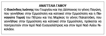 Αναγγελία Γάμου Βακόνδιου Ιωάννη και Παναγιώτας Τομαή Κείμενο Βλέπε εικόνα. Αριθμός Φύλλου: 6003 Κατηγορία: Αναγγελία Γάμου