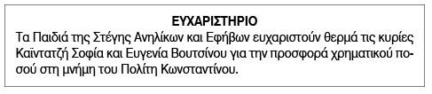 Ευχαριστήριο για δωρεές από τη Στέγη Ανηλίκων και Εφήβων Σύρου Κείμενο Βλέπε εικόνα. Αριθμός Φύλλου: 6006 Κατηγορία: Ευχαριστήριο