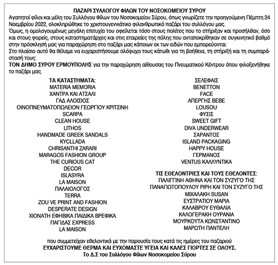 Ευχαριστήριο για Παζάρι από τον Σύλλογο Φίλων του Νοσοκομείου Σύρου Κείμενο Βλέπε εικόνα. Αριθμός Φύλλου: 6014 Κατηγορία: Ευχαριστήριο