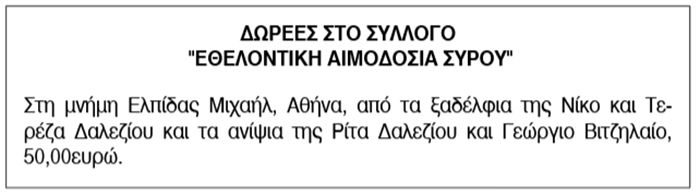 Ευχαριστήριο για δωρεές από τον Σύλλογο Εθελοντικής Αιμοδοσίας Σύρου Κείμενο Βλέπε εικόνα. Αριθμός Φύλλου: Αριθμός Φύλλου 6032 Κατηγορία: Κατηγορία Δωρεές