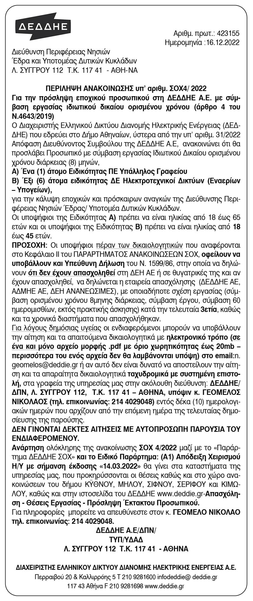 Περίληψη ανακοίνωσης υπ' αριθμ. ΣΟΧ 4/2022 από την ΔΕΔΔΗΕ Α.Ε. Κείμενο Βλέπε εικόνα. Αριθμός Φύλλου: 6032 Κατηγορία: Προκήρυξη Θέσεων