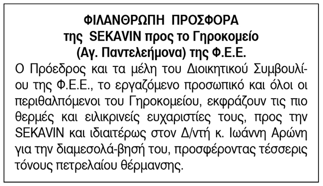 Ευχαριστήριο για Δωρεές από το γηροκομείο (Αγ. Παντελεήμονα) της Φ.Ε.Ε. Κείμενο Βλέπε εικόνα. Αριθμός Φύλλου: 6033 Κατηγορία: Δωρεές