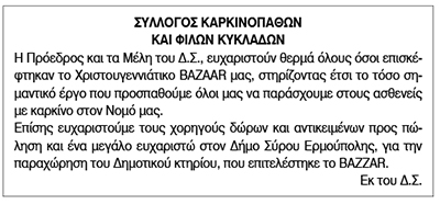 Ευχαριστήριο για BAZAAR από τον Σύλλογο Καρκινοπαθών και Φίλων Κυκλάδων Κείμενο Βλέπε εικόνα. Αριθμός Φύλλου: 6034 Κατηγορία: Ευχαριστήριο