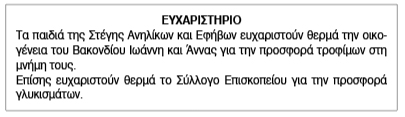 Ευχαριστήριο για δωρεές από τη Στέγη Ανηλίκων και Εφήβων Σύρου Κείμενο Βλέπε εικόνα. Αριθμός Φύλλου: 6046 Κατηγορία: Δωρεές