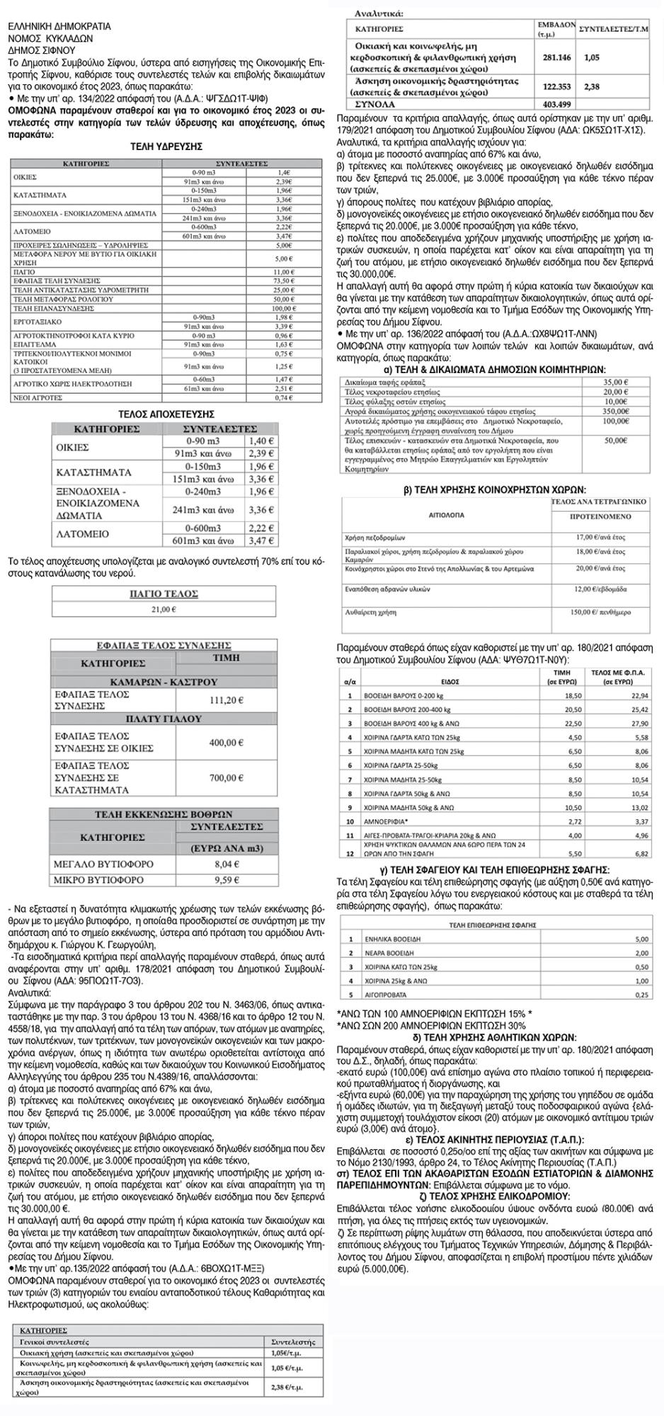 Τέλη ύδρευσης και αποχέτευσης από το Δήμο Σίφνου Κείμενο Βλέπε εικόνα. Αριθμός Φύλλου: Αριθμός Φύλλου 6047 Κατηγορία: Κατηγορία Απόφαση