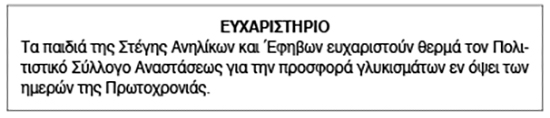 Ευχαριστήριο για δωρεές από τη Στέγη Ανηλίκων και Εφήβων Σύρου Κείμενο Βλέπε εικόνα. Αριθμός Φύλλου: 6051 Κατηγορία: Δωρεές
