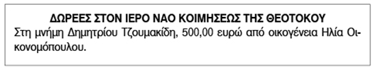 Δωρεά στον Ιερό Ναό Κοιμήσεως της Θεοτόκου Κείμενο Βλέπε εικόνα. Αριθμός Φύλλου: 6053 Κατηγορία: Δωρεές