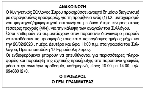 Προμήθεια ενός (1) Ι.Χ. μεταχειρισμένου φορτηγού/ημιφορτηγού αυτοκινήτου με δυνατότητα κίνησης στους τέσσερις τροχούς (4Χ4), για τις ανάγκες του Κυνηγετικού Συλλόγου Σύρου