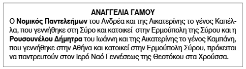 Αναγγελία Γάμου Νομικού Παντελεήμων και Ρουσουνέλου Δήμητρας Κείμενο Βλέπε εικόνα. Αριθμός Φύλλου: 6054 Κατηγορία: Αναγγελία Γάμου
