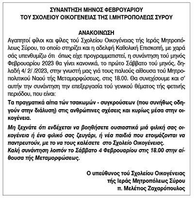 Ιερά Μητρόπολη Σύρου ανακοίνωση για το σχολείο οικογένειας για τον μήνα Φεβρουάριο 2023 Κείμενο Βλέπε εικόνα. Αριθμός Φύλλου: Αριθμός Φύλλου 6056 Κατηγορία: Κατηγορία Ανακοίνωση