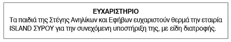 Ευχαριστήριο για δωρεές από τη Στέγη Ανηλίκων και Εφήβων Σύρου Κείμενο Βλέπε εικόνα. Αριθμός Φύλλου: 6060 Κατηγορία: Δωρεές