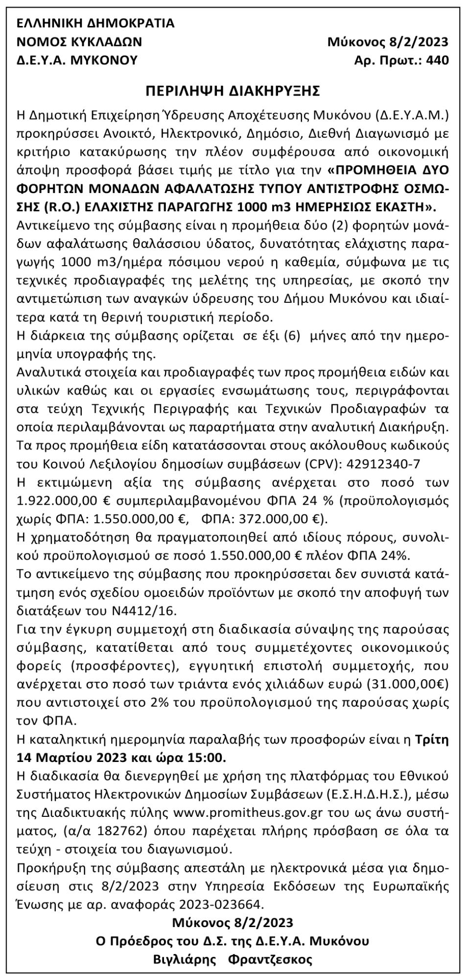 Προμήθεια δύο φορητών μονάδων αφαλάτωσης τύπου αντίστροφης όσμωσης (R.O.) ελάχιστης παραγωγής 1000 m3 ημερησίως έκαστη. Κείμενο Βλέπε εικόνα. Αριθμός Φύλλου: Αριθμός Φύλλου 6062 Κατηγορία: Κατηγορία Προκήρυξη Έργων - Δημοπρασίες