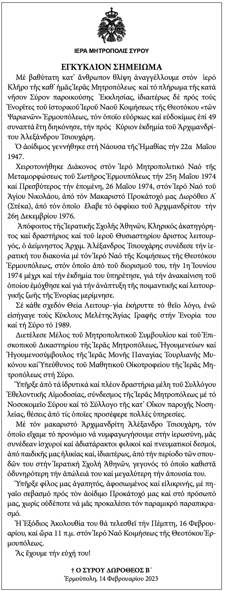 Αναγγελία Εκδημίας Αρχιμανδρίτη Αλέξανδρου Τσιουχάρη από την Ιερά Μητρόπολη Σύρου Κείμενο Βλέπε εικόνα. Αριθμός Φύλλου: Αριθμός Φύλλου 6064 Κατηγορία: Κατηγορία Ανακοίνωση