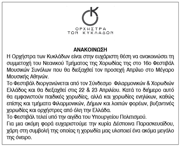 Ανακοίνωση της Ορχήστρας των Κυκλάδων για τη συμμετοχή του Νεανικού Τμήματος της Χορωδίας της στο 16ο Φεστιβάλ Μουσικών Συνόλων στο Μέγαρο Μουσικής Αθηνών