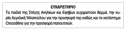 Ευχαριστήριο για δωρεές από τη Στέγη Ανηλίκων και Εφήβων Σύρου Κείμενο Βλέπε εικόνα. Αριθμός Φύλλου: Αριθμός Φύλλου 6071 Κατηγορία: Κατηγορία Δωρεές