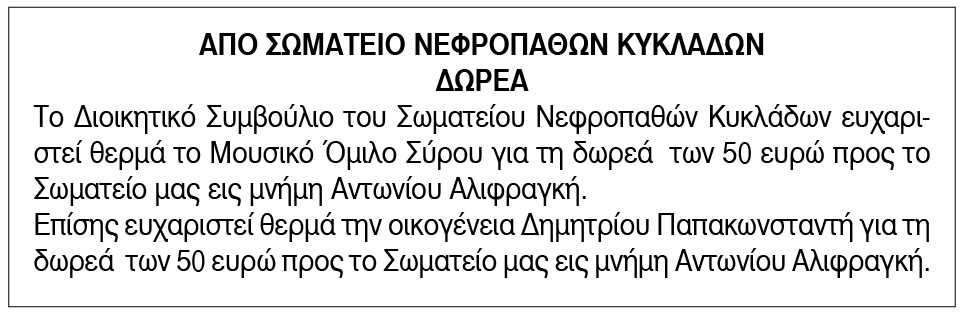 Ευχαριστήριο για δωρεές από το Σωματείο Νεφροπαθών Κυκλάδων Κείμενο Βλέπε εικόνα. Αριθμός Φύλλου: 6075 Κατηγορία: Δωρεές