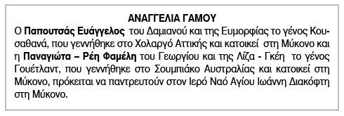 Αναγγελία Γάμου για Παπουτσά Ευάγγελο και Παναγιώτα - Ρέη Φαμέλη Κείμενο Βλέπε εικόνα. Αριθμός Φύλλου: 6078 Κατηγορία: Αναγγελία Γάμου