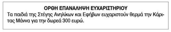 Ορθή επανάληψη Ευχαριστηρίου από τη Στέγη Ανηλίκων Σύρου Κείμενο Βλέπε εικόνα. Αριθμός Φύλλου: 6080 Κατηγορία: Δωρεές