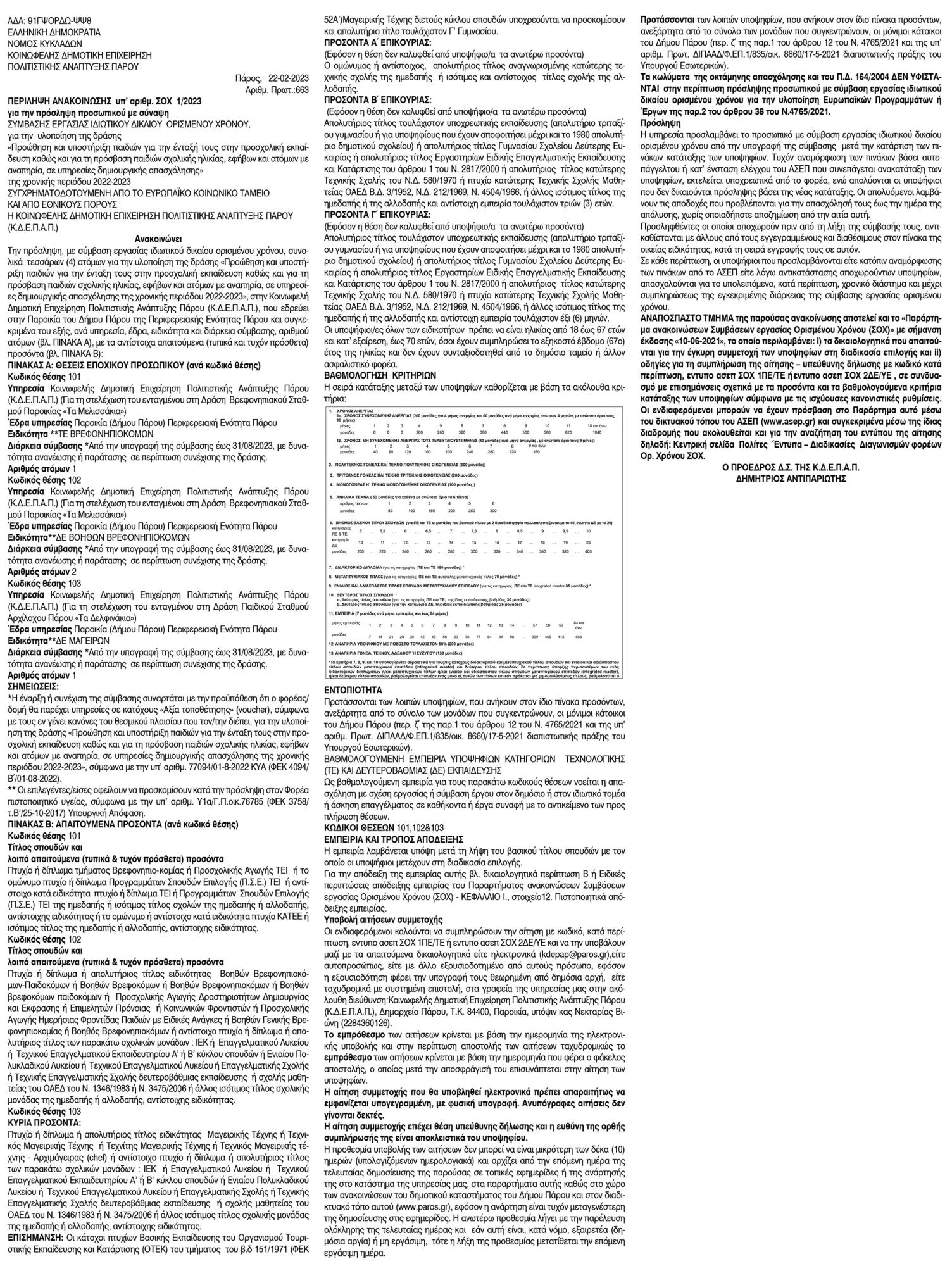 Περίληψη Ανακοίνωσης υπ' αριθμ. ΣΟΧ 1/2023 από την Δημοτική Επιχείρηση Πολιτιστικής Ανάπτυξης Πάρου ( Κ.Δ.Ε.Π.Α.Π.) Κείμενο Βλέπε εικόνα. Αριθμός Φύλλου: 6082 Κατηγορία: Προκήρυξη Θέσεων